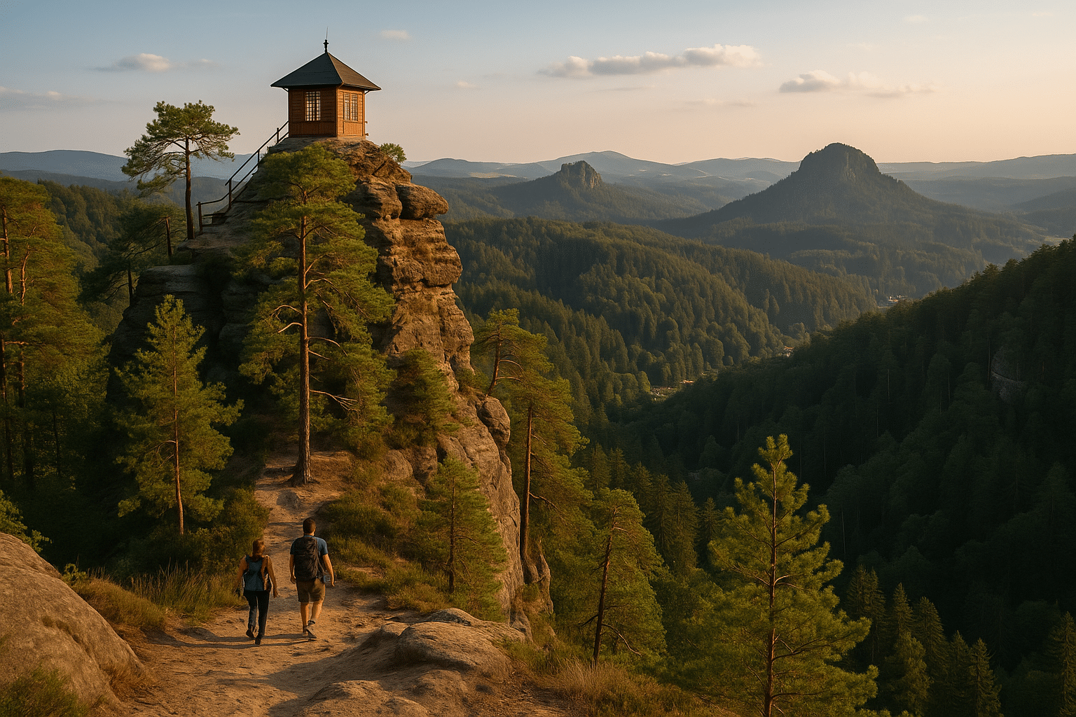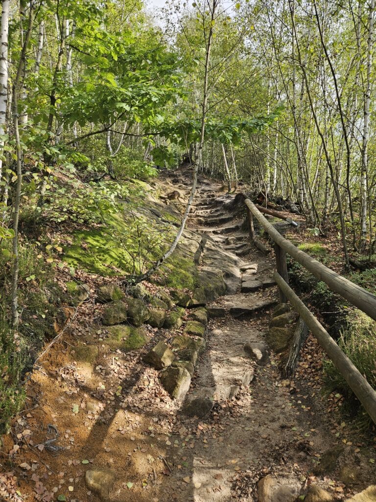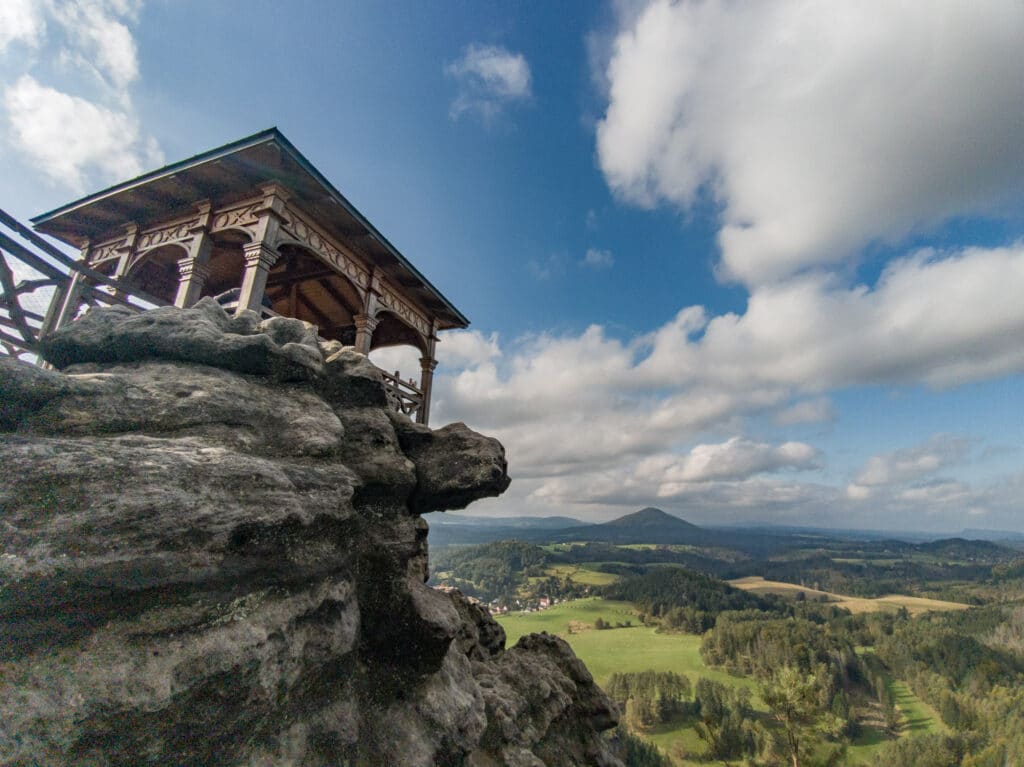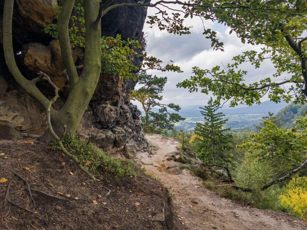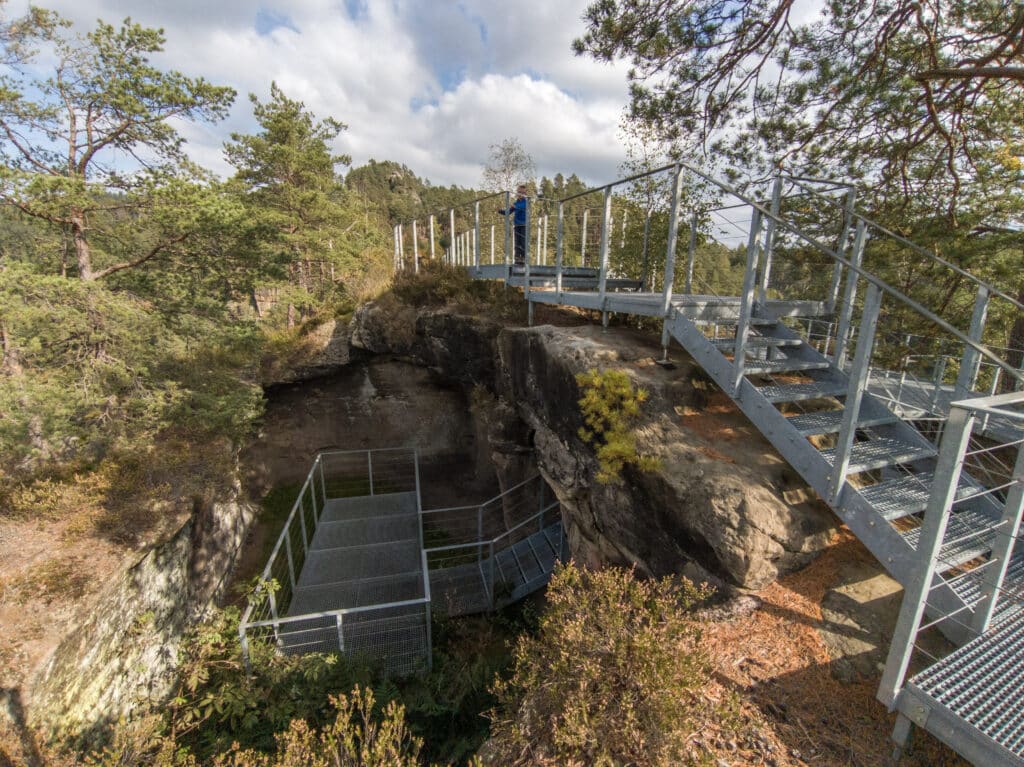Krásné výhledy na skály a lesy v národním parku České Švýcarsko. Dobrodružná trasa plná vyhlídek, stoupání po schodech a proplétání se úzkými cestičkami. A k tomu bonus – Zřícenina hradu Falkenštejn.