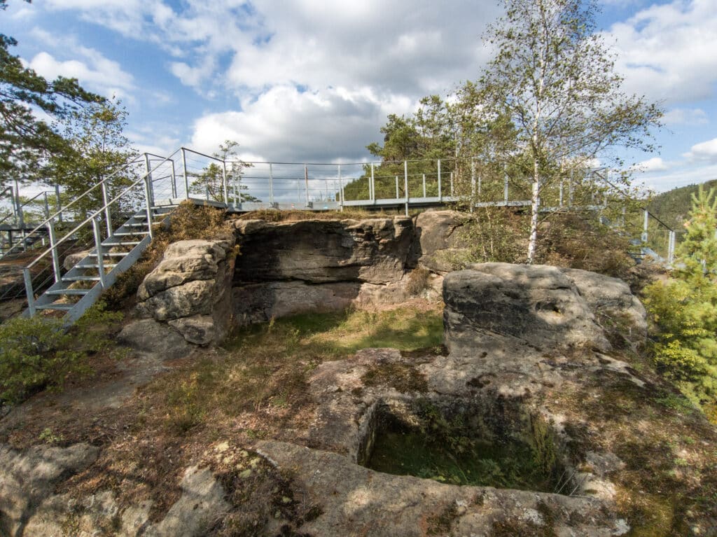Dalším velkým lákadlem na trase je vyhlídka Rudolfův kámen. Doporučujeme dbát velké opatrnosti, cesta nahoru i dolů je dost náročná (schody, klouzavé skály).